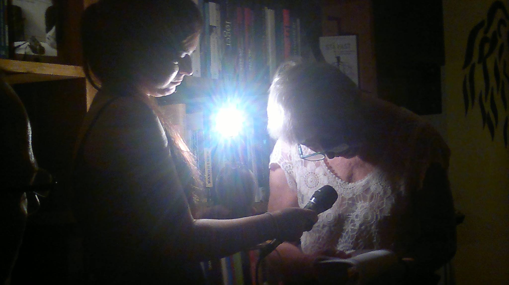 Inger-Marie Ørner får hjælp til at holde mikrofonen til Åben Poetisk Scene.